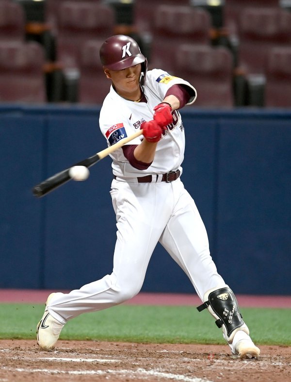 15일 서울 고척스카이돔에서 2023 KBO리그 시범경기 KIA 타이거즈와 키움 히어로즈 경기가 열렸다. 8회초 1사 1루 키움 김건희가 타격을 하고 있다.