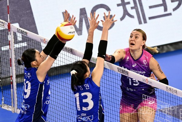 15일 경기도 화성종합실내체육관에서 ‘2022-2023 도드람 V리그’ 화성 IBK기업은행과 인천 흥국생명의 여자부 경기가 열렸다. 흥국생명 옐레나가 IBK기업은행 블로커를 피해 스파이크를 날리고 있다.