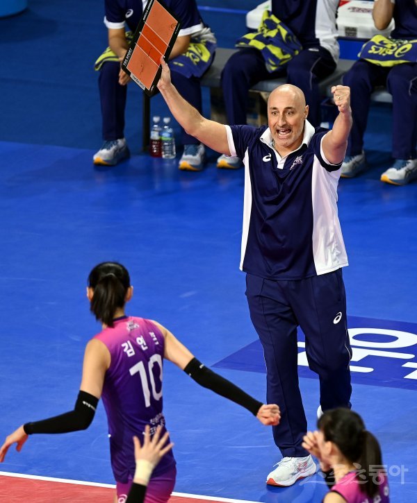 15일 경기도 화성종합실내체육관에서 ‘2022-2023 도드람 V리그’ 화성 IBK기업은행과 인천 흥국생명의 여자부 경기가 열렸다. 흥국생명 아본단자 감독이 김연경의 득점에 환호하고 있다.