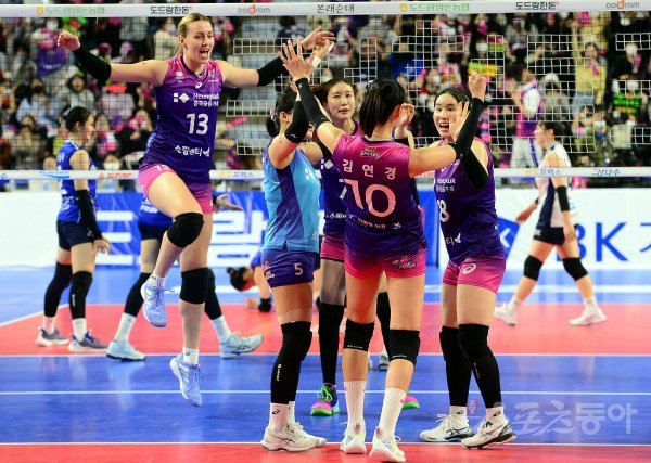 15일 경기도 화성종합실내체육관에서 ‘2022-2023 도드람 V리그’ 화성 IBK기업은행과 인천 흥국생명의 여자부 경기가 열렸다. 흥국생명 선수들이 2세트를 승리하며 정규리그 1위를 확정지은 후 선수들이 기뻐하고 있다.