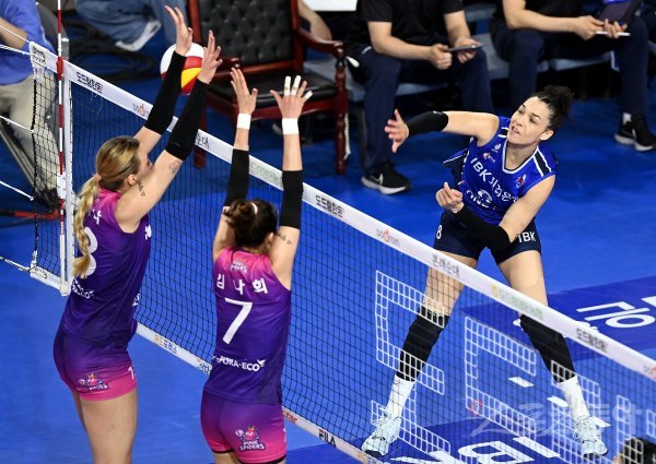 15일 경기도 화성종합실내체육관에서 ‘2022-2023 도드람 V리그’ 화성 IBK기업은행과 인천 흥국생명의 여자부 경기가 열렸다. IBK기업은행 산타가가 흥국생명 블로커를 피해 스파이크를 날리고 있다.