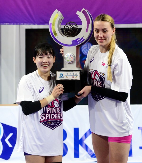 15일 경기도 화성종합실내체육관에서 ‘2022-2023 도드람 V리그’ 화성 IBK기업은행과 인천 흥국생명의 여자부 경기가 열렸다. 흥국생명이 정규리그 우승을 차지한 후 김해란과 옐레나가 우승트로피를 들고 기념촬영을 하고 있다.