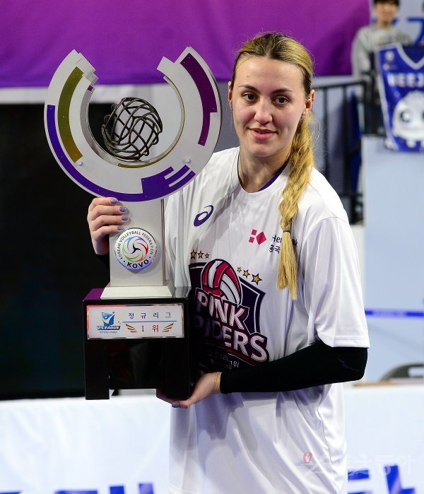 15일 경기도 화성종합실내체육관에서 ‘2022-2023 도드람 V리그’ 화성 IBK기업은행과 인천 흥국생명의 여자부 경기가 열렸다. 흥국생명이 정규리그 우승을 차지한 후 옐레나가 우승트로피를 들고 기념촬영을 하고 있다.