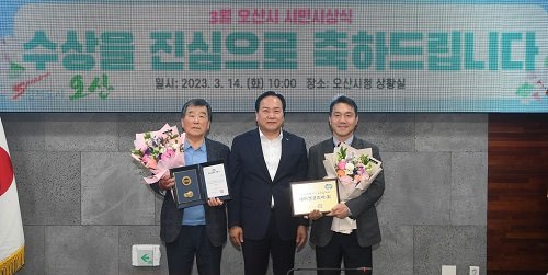 경기 오산시가 지난 14일 시민시상식에서 지역발전에 기여한 유공납세자 한유석·이승진 씨, 세미켓코리아주식회사에 각각 인증패를 수여했다.