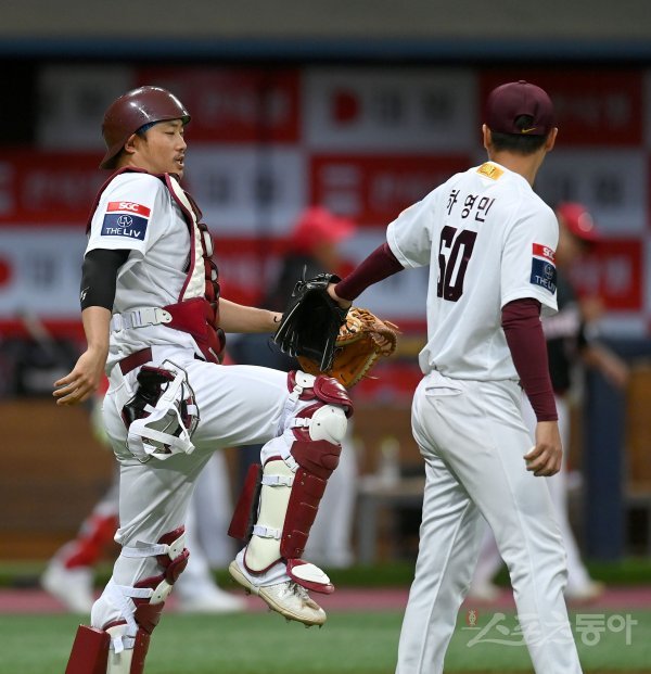 16일 서울 고척스카이돔에서 2023 KBO리그 시범경기 KIA 타이거즈와 키움 히어로즈 경기가 열렸다. 3-2 승리를 거둔 후 키움 이지영이 장난을 치고 있다.
