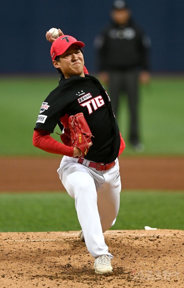 16일 서울 고척스카이돔에서 2023 KBO리그 시범경기 KIA 타이거즈와 키움 히어로즈 경기가 열렸다. 선발 투수로 등판한 KIA 윤영철이 역투하고 있다.