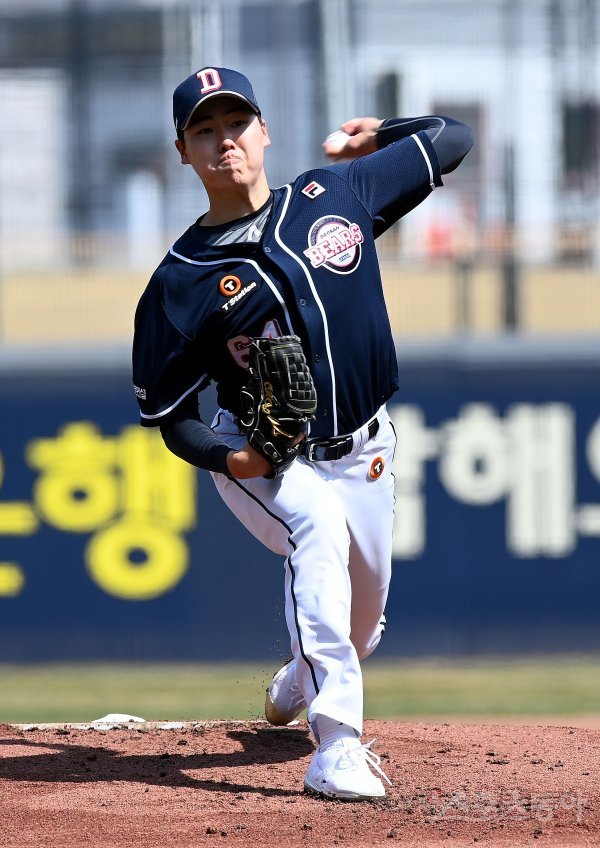 19일 광주기아챔피언스필드에서 ‘2023 KBO리그’ KIA 타이거즈와 두산 베어스의 시범경기가 열렸다. 두산 선발투수 최승용이 힘차게 볼을 던지고 있다.