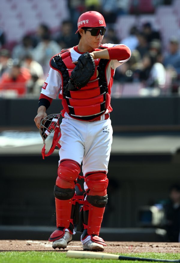 19일 광주기아챔피언스필드에서 ‘2023 KBO리그’ KIA 타이거즈와 두산 베어스의 시범경기가 열렸다. KIA 포수 주효상이 이닝 종료 후 더그아웃으로 향하고 있다.