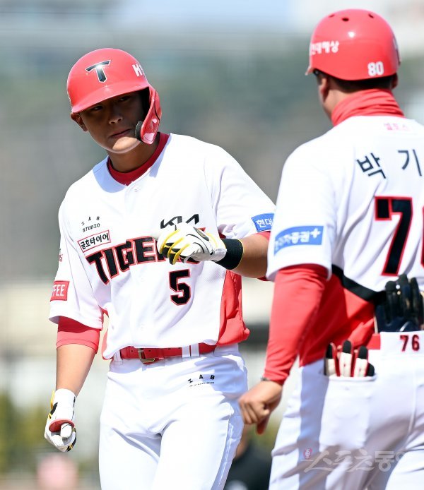 19일 광주기아챔피언스필드에서 ‘2023 KBO리그’ KIA 타이거즈와 두산 베어스의 시범경기가 열렸다. 5회마 1사 만루에서 KIA 김도영이 2타점 역전 적시타를 날린 후 코치의 환영을 받고 있다.