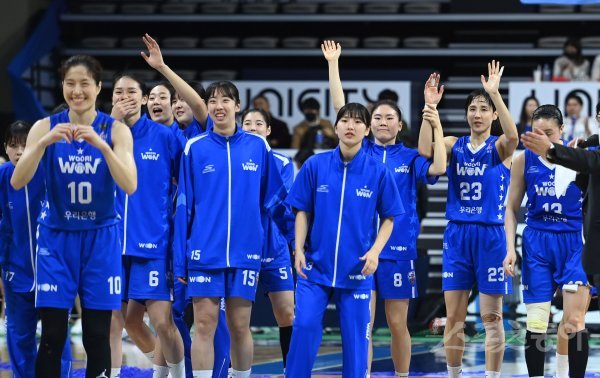 19일 아산이순신체육관에서 열린‘신한은행 SOL 2022~2023 여자프로농구‘ 챔피언결정전 1차전 우리은행과 BNK 썸 경기에서 62-56 승리를 거둔 우리은행 선수들이 기뻐하고 있다.