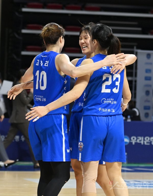 19일 아산이순신체육관에서 열린‘신한은행 SOL 2022~2023 여자프로농구‘ 챔피언결정전 1차전 우리은행과 BNK 썸 경기에서 62-56 승리를 거둔 우리은행 박지현과 선수들이 기뻐하고 있다.