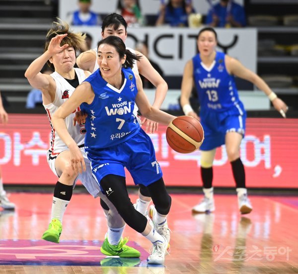 19일 아산이순신체육관에서 열린‘신한은행 SOL 2022~2023 여자프로농구‘ 챔피언결정전 1차전 우리은행과 BNK 썸 경기에서 우리은행 박혜진이 BNK의 수비를 뚫고 골밑을 공격하고 있다.