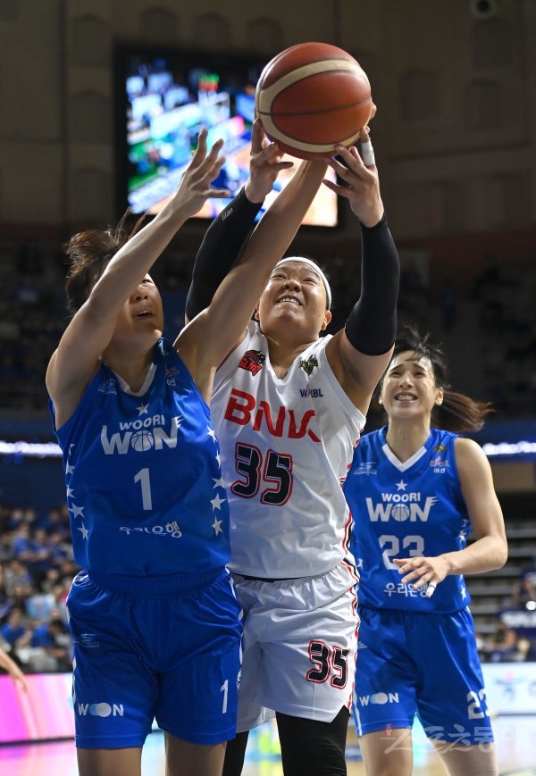 19일 아산이순신체육관에서 열린‘신한은행 SOL 2022~2023 여자프로농구‘ 챔피언결정전 1차전 우리은행과 BNK 썸 경기에서 우리은행 박지현과 BNK 김한별이 리바운드 볼을 다투고 있다.