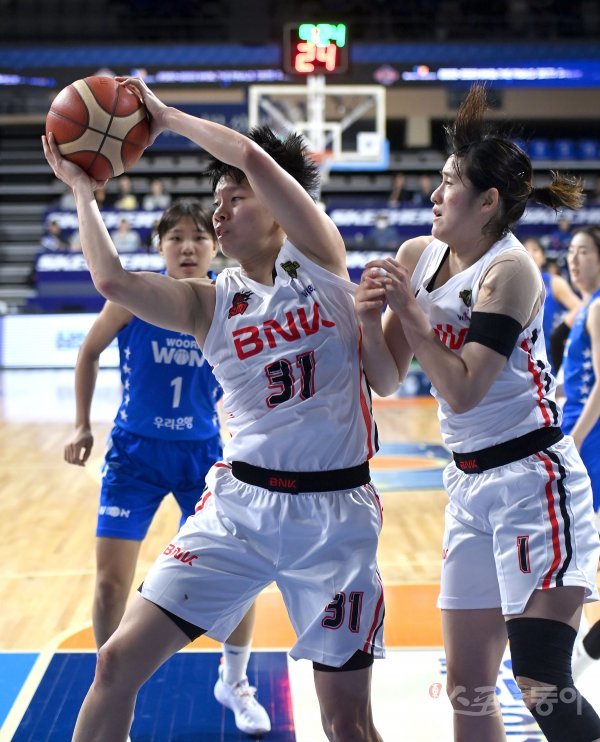 19일 아산이순신체육관에서 열린‘신한은행 SOL 2022~2023 여자프로농구‘ 챔피언결정전 1차전 우리은행과 BNK 썸 경기에서 BNK 진안이 리바운드 볼을 잡고 있다.