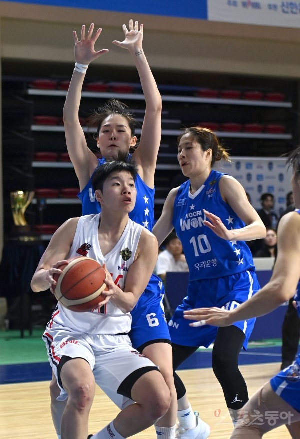 19일 아산이순신체육관에서 열린‘신한은행 SOL 2022~2023 여자프로농구‘ 챔피언결정전 1차전 우리은행과 BNK 썸 경기에서 BNK 진안이 우리은행의 수비를 뚫고 골밑을 공격하고 있다.