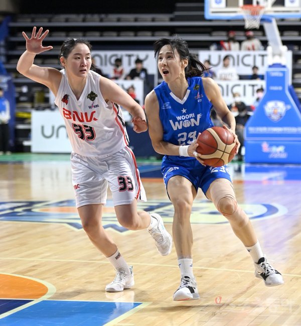 19일 아산이순신체육관에서 열린‘신한은행 SOL 2022~2023 여자프로농구‘ 챔피언결정전 1차전 우리은행과 BNK 썸 경기에서 우리은행 김단비가 BNK의 수비를 뚫고 골밑을 공격하고 있다.