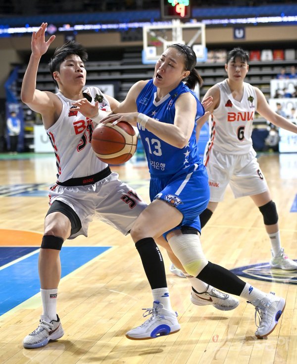 19일 아산이순신체육관에서 열린‘신한은행 SOL 2022~2023 여자프로농구‘ 챔피언결정전 1차전 우리은행과 BNK 썸 경기에서 우리은행 김정은이 BNK 진안의 수비를 뚫고 골밑을 공격하고 있다.