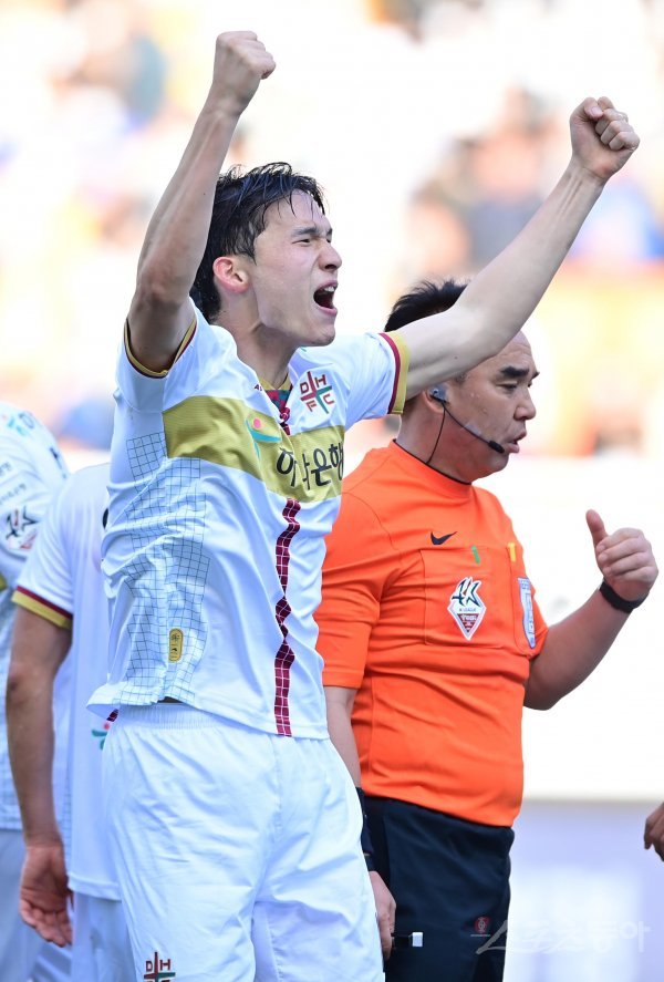 19일 경기도 수원월드컵경기장에서 열린 ‘하나원큐 K리그1 2023’ 수원 삼성과 대전 하나의 경기에서 대전 변준수가 두 번째 골을 성공시킨 후 포효하고 있다.