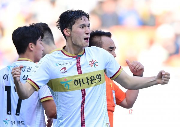 19일 경기도 수원월드컵경기장에서 열린 ‘하나원큐 K리그1 2023’ 수원 삼성과 대전 하나의 경기에서 대전 변준수가 두 번째 골을 성공시킨 후 기뻐하고 있다.