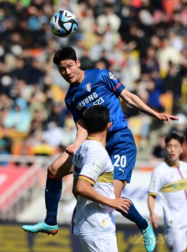 19일 경기도 수원월드컵경기장에서 열린 ‘하나원큐 K리그1 2023’ 수원 삼성과 대전 하나의 경기에서 수원 박희준이 헤딩슛을 하고 있다.