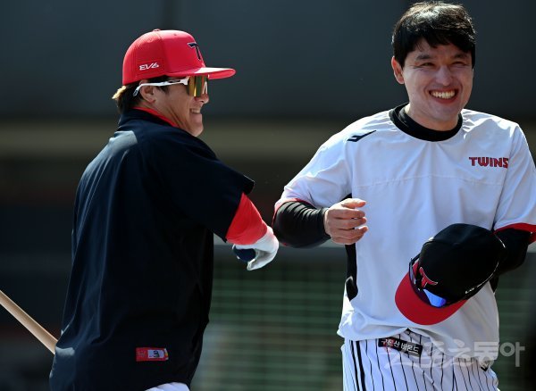 20일 광주기아챔피언스필드에서 ‘2023 KBO리그’ KIA 타이거즈와 LG 트윈스의 시범경기가 열린다. 경기 전 KIA 김선빈이 LG 박동원에게 장난을 치고 있다.