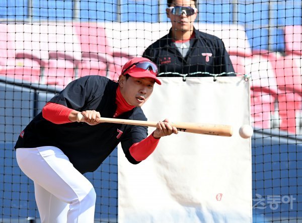 20일 광주기아챔피언스필드에서 ‘2023 KBO리그’ KIA 타이거즈와 LG 트윈스의 시범경기가 열린다. 경기 전 KIA 고종욱이 번트 훈련을 하고 있다.