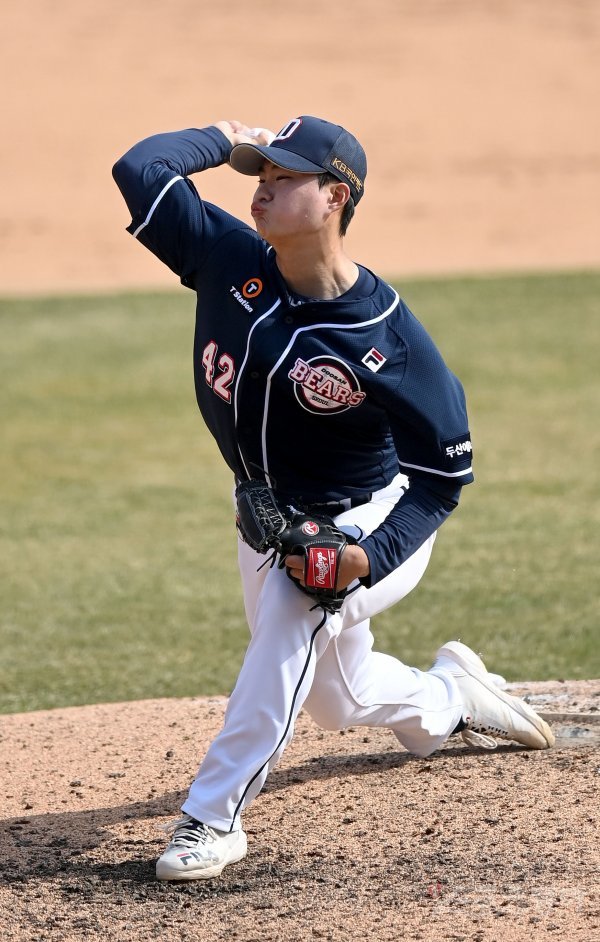 20일 수원KT 위즈파크에서 2023 KBO리그 시범경기 두산 베어스와 KT 위즈 경기가 열렸다. 교체 등판한 두산 최지강이 역투하고 있다.