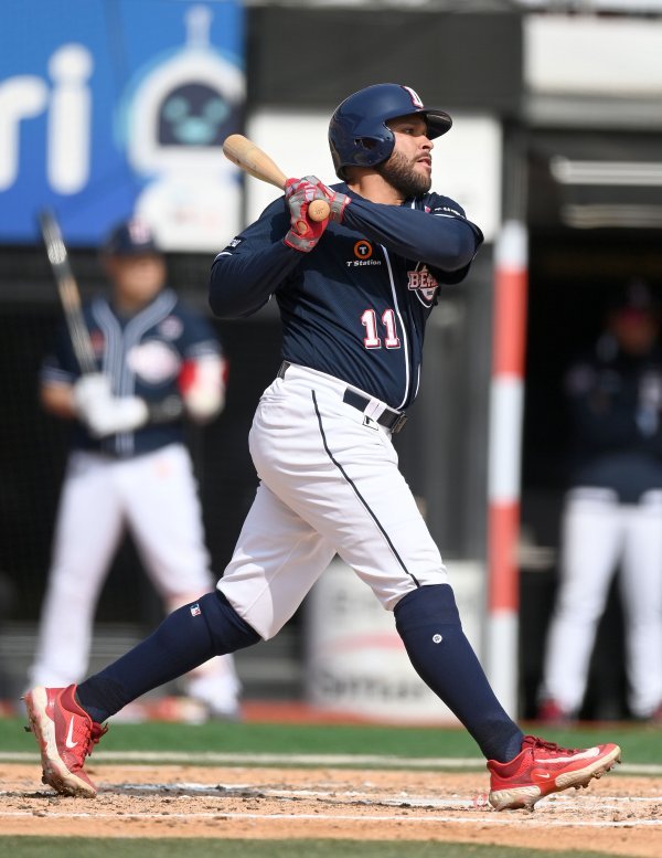 20일 수원KT 위즈파크에서 2023 KBO리그 시범경기 두산 베어스와 KT 위즈 경기가 열렸다. 6회초 무사 두산 로하스가 중전 2루타를 치고 있다.