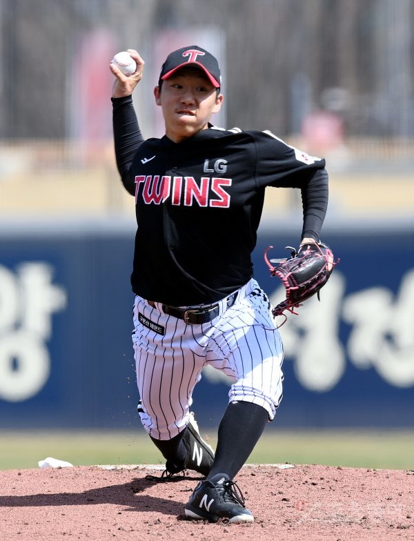 20일 광주기아챔피언스필드에서 ‘2023 KBO리그’ KIA 타이거즈와 LG 트윈스의 시범경기가 열렸다. LG 선발투수 박병근이 힘차게 볼을 던지고 있다.