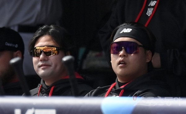 20일 수원KT 위즈파크에서 2023 KBO리그 시범경기 두산 베어스와 KT 위즈 경기가 열렸다. 선발 출전하지 않은 KT 김상수와 강백호가 더그아웃에서 경기를 바라보고 있다.