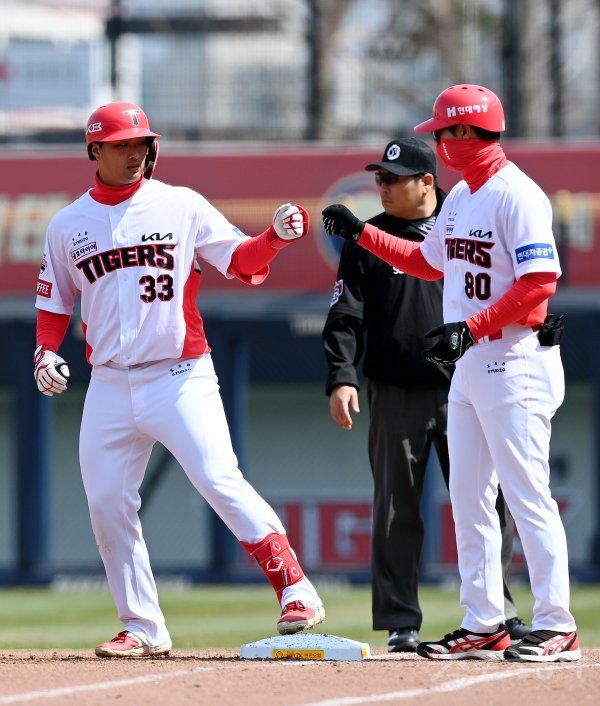 20일 광주기아챔피언스필드에서 ‘2023 KBO리그’ KIA 타이거즈와 LG 트윈스의 시범경기가 열렸다. 1회말 2사 3루에서 KIA 변우혁이 1타점 적시타를 날린 후 코치의 환영을 받고 있다.