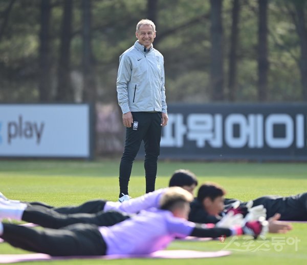 한국축구대표팀이 20일 경기도 파주 축구대표팀트레이닝센터(NFC)에서 콜롬비아와 우루과이의 친선경기에 앞서 소집훈련을 진행했다. 한국 클린스만 감독이 선수들의 훈련을 지켜보고 있다.