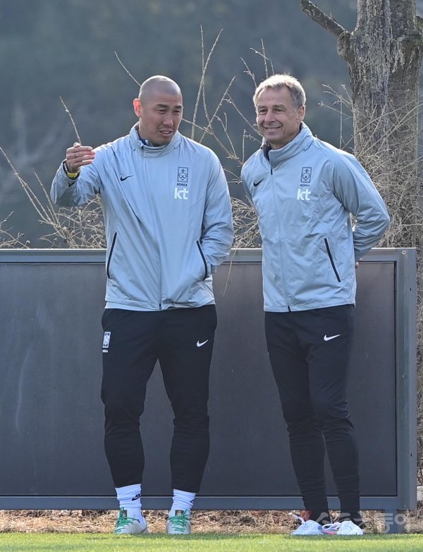 한국축구대표팀이 20일 경기도 파주 축구대표팀트레이닝센터(NFC)에서 콜롬비아와 우루과이의 친선경기에 앞서 소집훈련을 진행했다. 한국 클린스만 감독이 차두리 어드바이저와 이야기를 하고 있다.