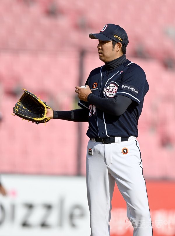 21일 수원KT 위즈파크에서 2023 KBO리그 시범경기 두산 베어스와 KT 위즈 경기가 열렸다. 7회말 2사 만루 상황에 등판해 밀어내기 볼넷을 허용한 두산 장원준이 아쉬워하고 있다.