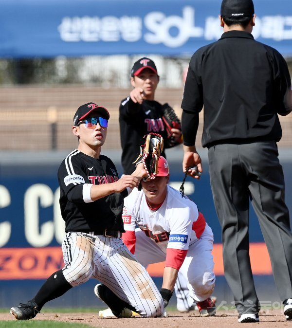 21일 광주기아챔피언스필드에서 ‘2023 KBO리그’ KIA 타이거즈와 LG 트윈스의 시범경기가 열렸다. 7회말 1사 1루에서 LG 서건창이 2루 도루를 시도하던 KIA 최정용을 태그 아웃시키고 있다.