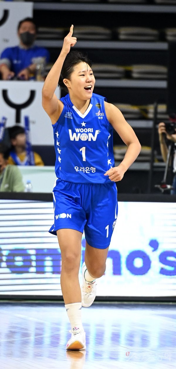 21일 아산이순신체육관에서 열린 ‘신한은행 SOL 2022~2023 여자프로농구‘ 챔피언결정전 2차전 우리은행과 BNK 썸 경기에서 우리은행 박지현이 3점슛을 성공시킨 후 기뻐하고 있다.