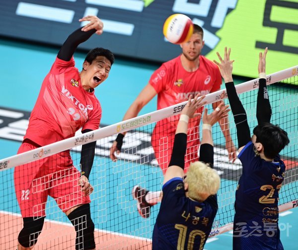 22일 서울 장충체육관에서 열린 ‘2022-2023 도드람 V-리그’ 포스트시즌 남자부 서울 우리카드와 수원 한국전력의 준플레이오프 경기에서 한국전력 신영석이 우리카드 블로커 앞에서 스파이크를 하고 있다.