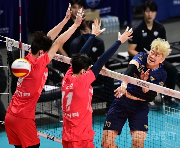 22일 서울 장충체육관에서 열린 ‘2022-2023 도드람 V-리그’ 포스트시즌 남자부 서울 우리카드와 수원 한국전력의 준플레이오프 경기에서 우리카드 나경복이 한국전력 블로커 앞에서 스파이크를 하고 있다.