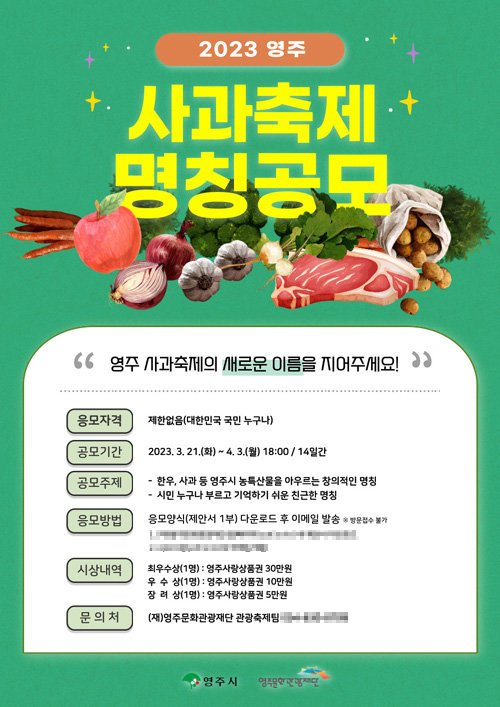경북 영주시가 한우, 사과 등 영주 농·특산물을 아우르는 새로운 축제 명칭을 찾고자 전 국민을 대상으로 공모를 진행한다.그동안 시는 영주 사과의 우수성을 알리기 위해 매년 ‘영주 사과축제’를 개최해 왔다. 하지만 올해부터는 ‘영주 사과’를 포함한 우수한 영주 농·특산물을 널리 알릴 새로운 축제로 확대 추진을 결정하고 새로운 축제에 걸맞은 명칭을 공모하게 됐다.