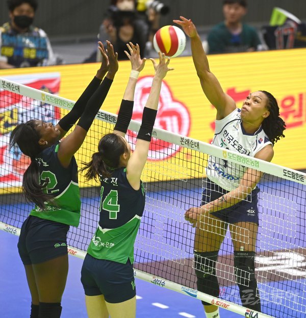 23일 수원체육관에서 열린 ‘2022~2023 도드람 V-리그’ 여자부 플레이오프 1차전 현대건설과 한국도로공사 경기에서 한국도로공사 캣벨이 현대건설의 블로킹 사이로 스파이크를 날리고 있다.