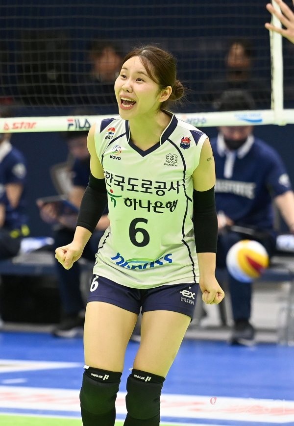 23일 수원체육관에서 열린 ‘2022~2023 도드람 V-리그’ 여자부 플레이오프 1차전 현대건설과 한국도로공사 경기에서 한국도로공사 이윤정이 팀 득점에 기뻐하고 있다.