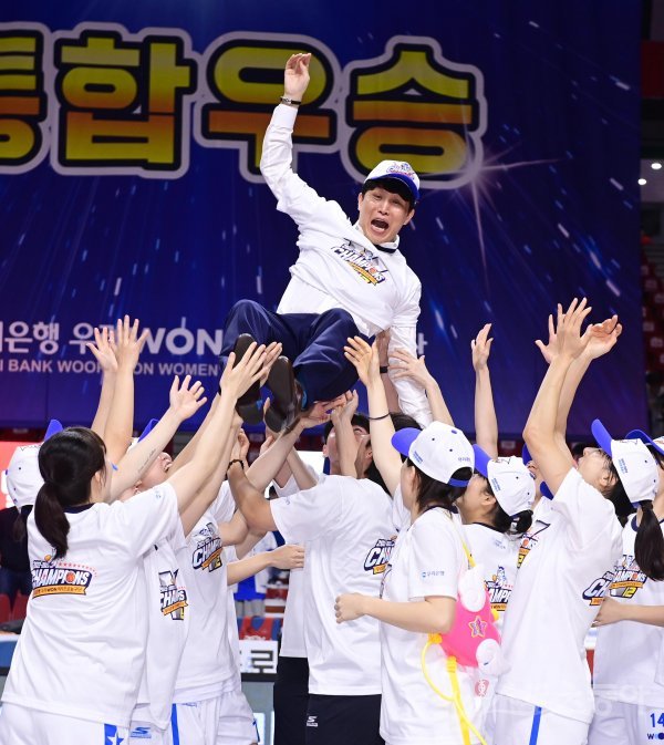 23일 부산 사직종합운동장 실내체육관에서 열린 ‘신한은행 SOL 2022~2023 여자프로농구‘ 부산 BNK와 아산 우리은행의 챔피언결정전 3차전 경기에서 승리로 통합우승을 확정지은 우리은행 위성우 감독이 선수들의 헹가래를 받고 있다.