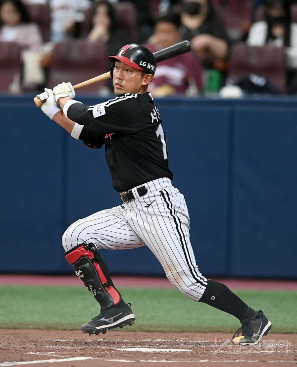 26일 서울 고척스카이돔에서 2023 KBO리그 시범경기 LG 트윈스와 키움 히어로즈 경기가 열렸다. 3회초 무사 LG 서건창이 중전 안타를 치고 있다.