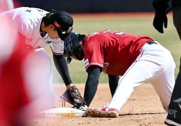 26일 경기도 수원 kt위즈파크에서 ‘2023 KBO리그’ kt 위즈와 SSG 랜더스의 시범경기가 열렸다. 3회초 2사 1루에서 SSG 1루 주자 오태곤이 2루 도루를 성공시키고 있다.
