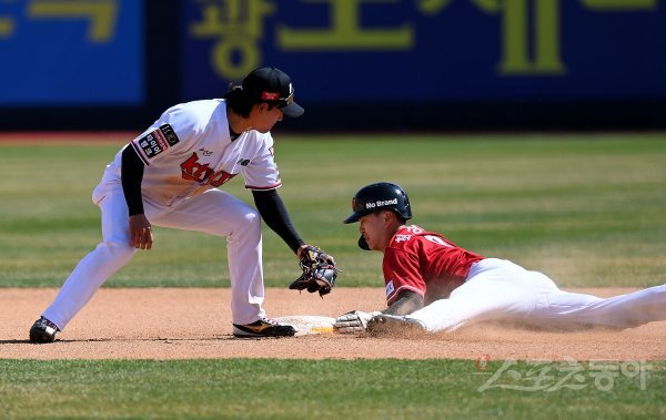26일 경기도 수원 kt위즈파크에서 ‘2023 KBO리그’ kt 위즈와 SSG 랜더스의 시범경기가 열렸다. 6회초 2사 1루에서 SSG 대주자 최상민이 2루 도루를 성공시키고 있다.