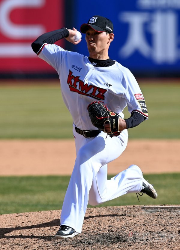 26일 경기도 수원 kt위즈파크에서 ‘2023 KBO리그’ kt 위즈와 SSG 랜더스의 시범경기가 열렸다. 9회초 kt 마무리 김재윤이 구원 등판해 볼을 던지고 있다.