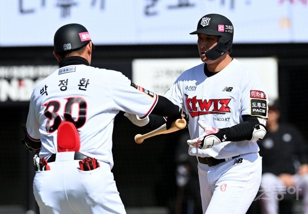 26일 경기도 수원 kt위즈파크에서 ‘2023 KBO리그’ kt 위즈와 SSG 랜더스의 시범경기가 열렸다. 4회말 무사에서 kt 황재균이 솔로 홈런을 쏘아 올린 후 코치의 환영을 받고 있다.