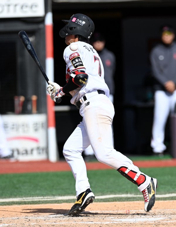 26일 경기도 수원 kt위즈파크에서 ‘2023 KBO리그’ kt 위즈와 SSG 랜더스의 시범경기가 열렸다. 6회말 1사 3루에서 kt 김상수가 투구에 맞고 있다.
