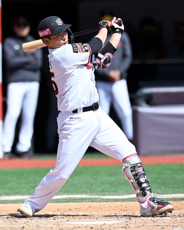 26일 경기도 수원 kt위즈파크에서 ‘2023 KBO리그’ kt 위즈와 SSG 랜더스의 시범경기가 열렸다. 2회말 2사 1루에서 kt 강현우가 안타를 날리고 있다.