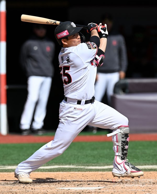 26일 경기도 수원 kt위즈파크에서 ‘2023 KBO리그’ kt 위즈와 SSG 랜더스의 시범경기가 열렸다. 4회말 1사 2루에서 kt 강현우가 1타점 적시타를 날리고 있다.